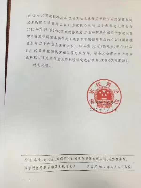 關于之前一直眾說紛紜的,環(huán)衛(wèi)車將2017年7月1日專用車取消免稅說法,現在國家稅務總局的正式文件已經下發(fā), 已證實, 并不是取消專用車免稅政策, 只是從7月1日起更換免稅圖冊, 新的免稅圖冊沒有下來之前不能辦理免稅 ,所以請需要購新車的客戶提前訂車, 避免造車麻煩 ,環(huán)衛(wèi)車購置稅免征情況說明1、《歷史免稅圖冊》(2005年1月-2016年5月下發(fā)的《免稅圖冊》)將于2017年7月31日停止執(zhí)行。2、《歷史免稅圖冊》中的免征車型由車輛生產企業(yè)于2017年6月30日前重新提交相關信息與資料進行審核,更新《免稅圖冊》。原文如下: