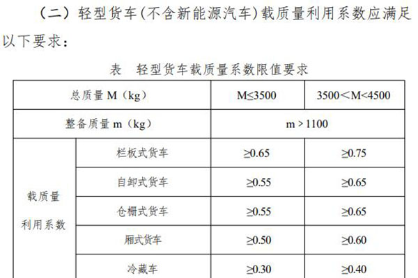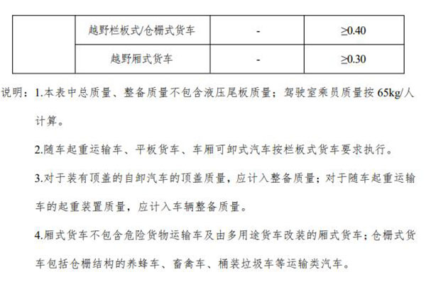 對(duì)載質(zhì)量系數(shù)的要求中包含很多專用車型,其中隨車起重運(yùn)輸車、平板貨車、車廂可卸式汽車按欄板式貨車要求執(zhí)行;對(duì)于裝有頂蓋的自卸汽車的頂蓋質(zhì)量,應(yīng)計(jì)入整備質(zhì)量,對(duì)于隨車起重運(yùn)輸車的起重裝置質(zhì)量,應(yīng)計(jì)入車輛整備質(zhì)量;廂式貨車不包含貨物運(yùn)輸車及由多用途貨車改裝的廂式貨車,倉(cāng)柵式貨車包括倉(cāng)柵結(jié)構(gòu)的養(yǎng)蜂車、畜禽車、桶裝垃圾車等運(yùn)輸類汽車。
