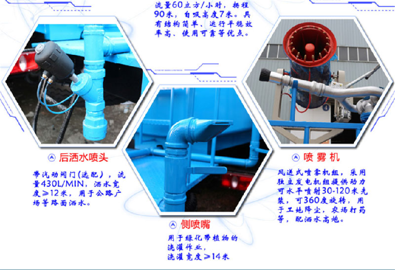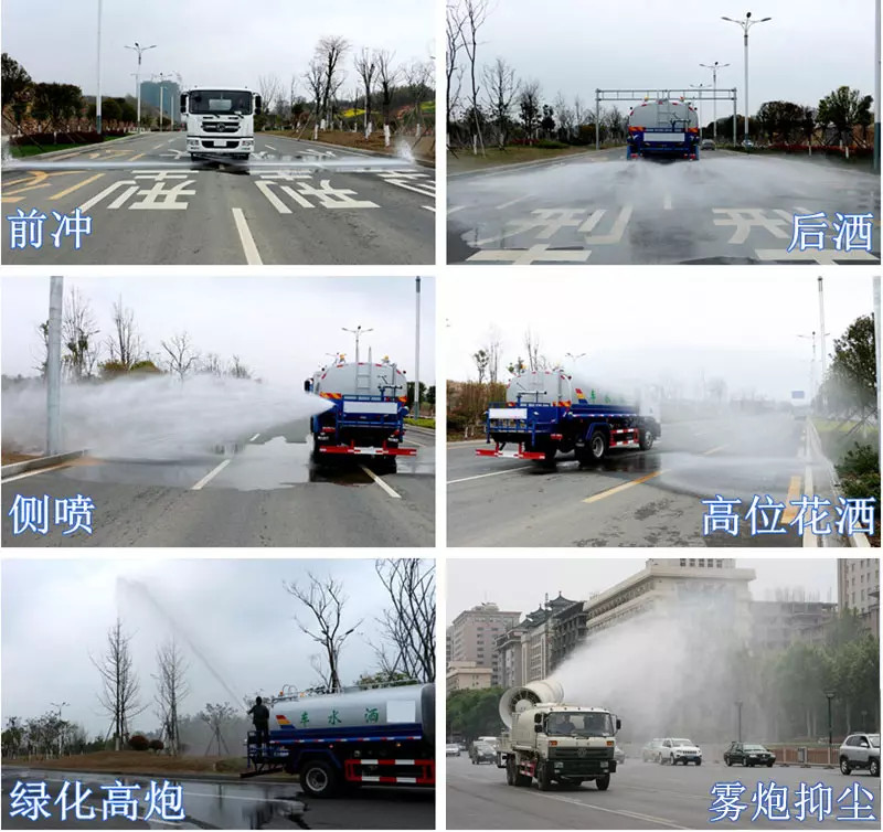 上裝配置:罐體采用國(guó)標(biāo)Q235碳鋼板材制作,產(chǎn)品質(zhì)量成熟可靠,設(shè)計(jì)**合理,比同類(lèi)灑水泵吸程遠(yuǎn)、壓力大、使用壽命長(zhǎng),可泵進(jìn)泵出。前沖、后灑、側(cè)噴、高位花灑、帶后工作平臺(tái)及綠化灑水高炮(可全方位旋轉(zhuǎn),可連續(xù)調(diào)成直沖狀、大雨、小雨、毛毛雨等),抑塵霧炮(可降塵、噴霧、消毒、打農(nóng)藥等),水位計(jì),消防栓接口、快速接口、兩根輸水管,其余標(biāo)配。